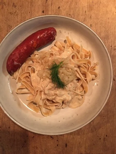 Serving Instructions: Place noodles on plate, ladle sauce with brats over noodles and top with ¼ cup of fermented sauerkraut. Don’t heat the sauerkraut as the heat will kill the fermented microbes which you want to aid your gut health.